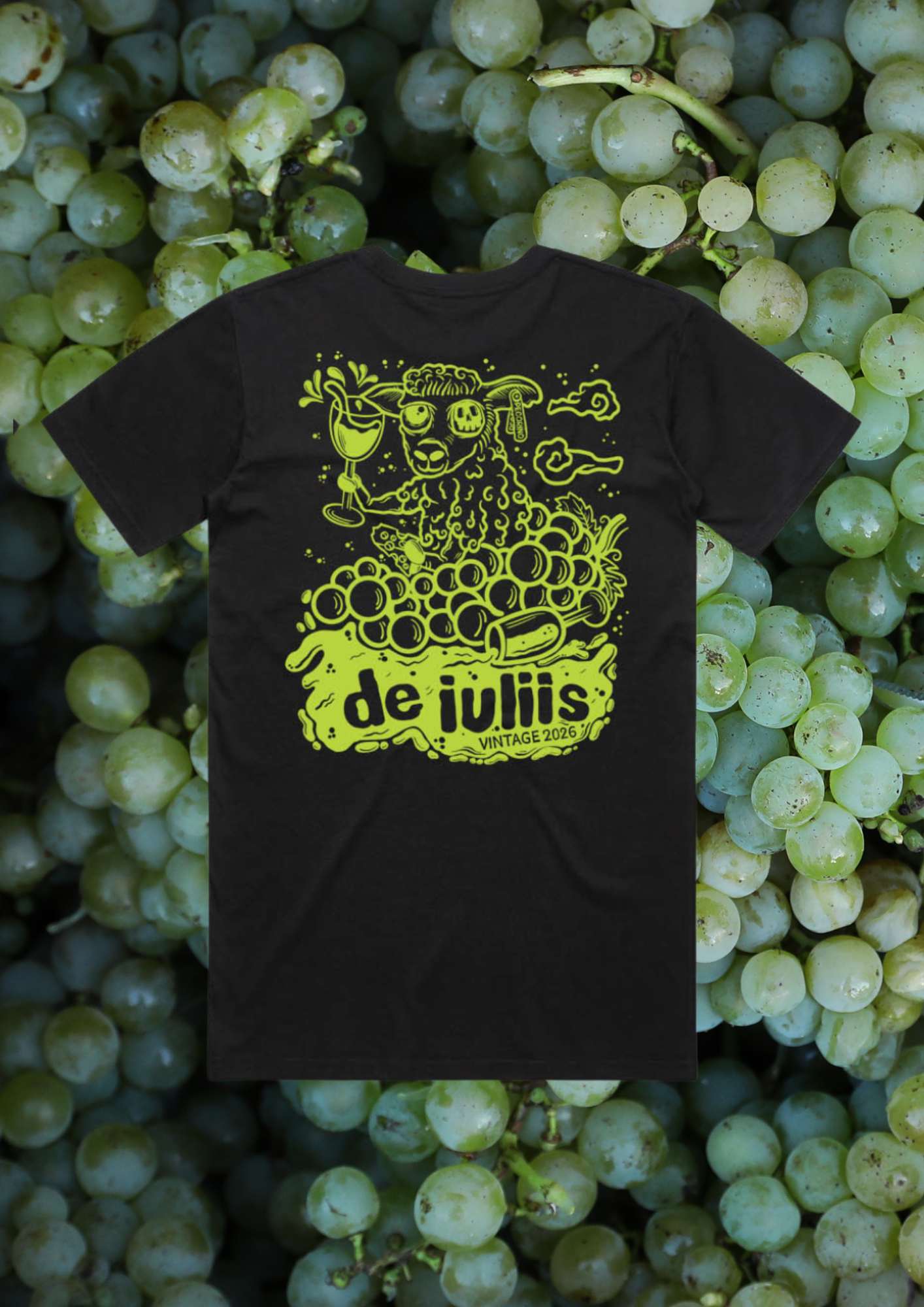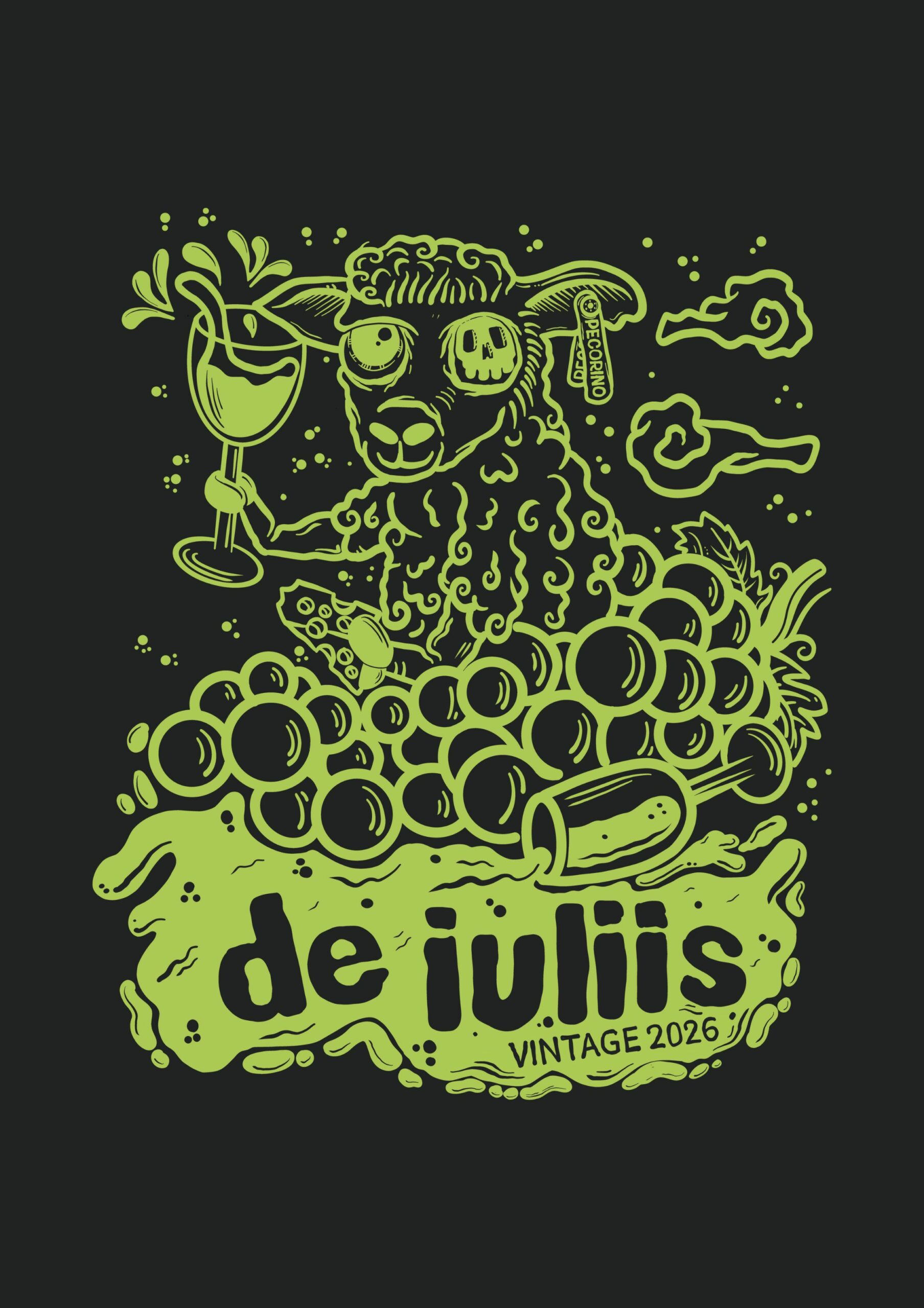 This year’s design, created by the visionary Aidan, is a surrealist trip into the heart of our latest obsession. It’s a high-voltage fever dream featuring a wine-toting sheep, skull-eyed stares, and a literal flood of flavour. It’s bold, it’s trippy, and it’s a complete departure from anything we’ve done before—a wearable testament to the fact that at De Iuliis, the only constant is change.